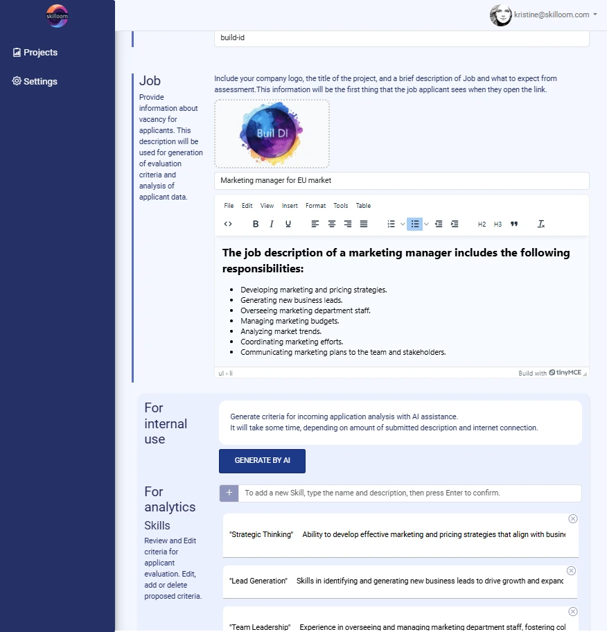 Easily define your hiring criteria or let Skilloom AI in few seconds generate a tailored list for you. These criteria will be used to efficiently structure incoming applicant data, ensuring you focus on the most qualified candidates.